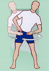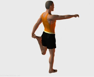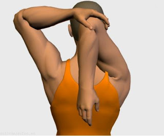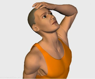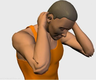 Entrelazamos los dedos detrás de la espalda. Giraremos lentamente los codos hacia adentro, mientras se estiran los brazos. Se levantan los brazos por detrás hasta notar el estiramiento de los hombros, el pecho o los mismos brazos. Mantendremos el pecho sacado y la barbilla hacia adentro